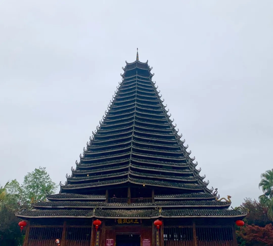 仰觀閃閃魔幻,感受侗族建設(shè)的精美藝術(shù),把疏密、粗細(xì)、剛?cè)岬韧昝赖亟Y(jié)成一個整體,展現(xiàn)侗族工匠的精美建筑技藝。不用一顆鐵釘,結(jié)構(gòu)十分嚴(yán)謹(jǐn)穩(wěn)固。樓內(nèi)四根杉木大柱直徑都超過70厘米,樹齡均在百年以上,這在鼓樓建筑史上是唯一的。