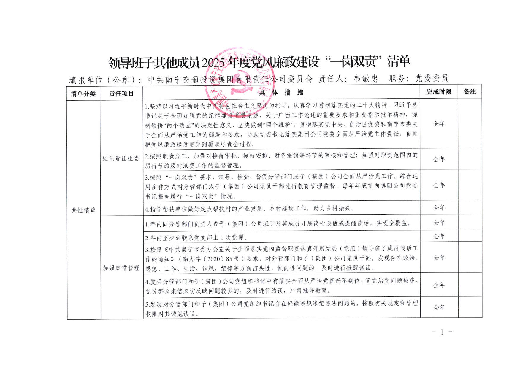 南寧交投集團領(lǐng)導(dǎo)班子其他成員2025年度黨風廉政建設(shè)“一崗雙責”清單(七)